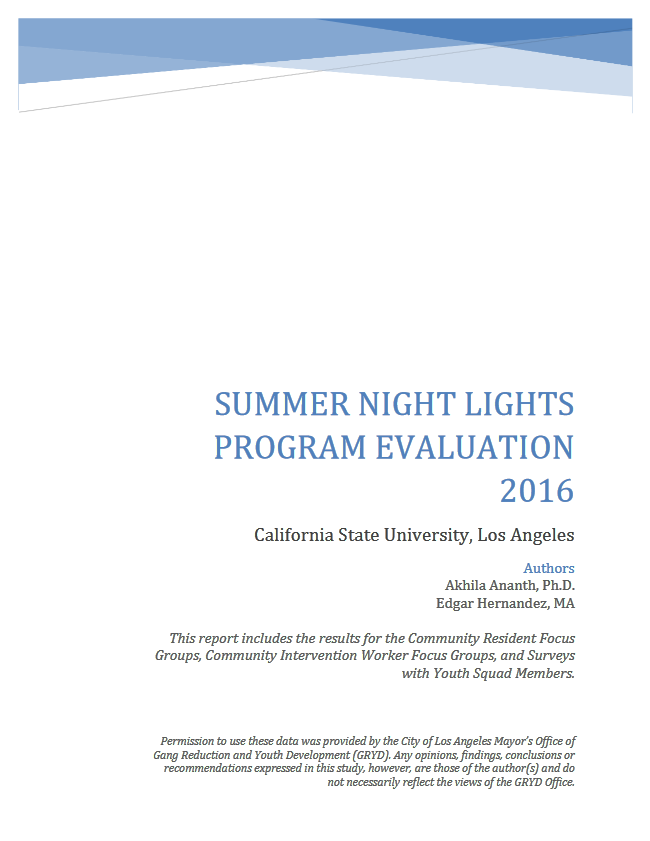 This evaluation report presents findings form the Summer Night Lights evaluation in 2016, including program statistics, six feedback forums of community residents, and a focus group with 10 SNL Lead Community Intervention Workers.